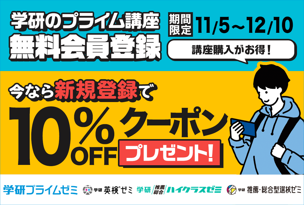 期間中「学研のプライム講座」無料会員登録した方に、特典として10%割引クーポンをプレゼントします。