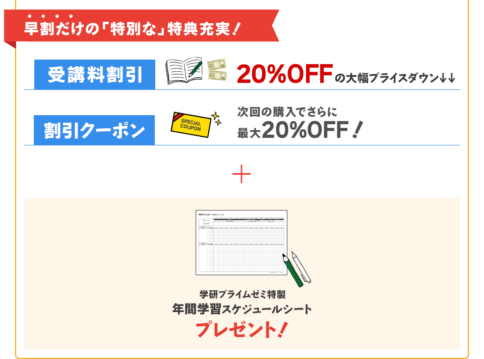 期間中にセット講座をご購入いただいた方に、学研プライムゼミ特製の年間学習スケジュールシートを進呈します。