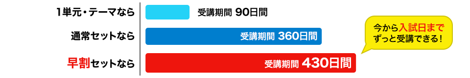 〔特典2〕受講期間の大幅延長[第1弾期間で適用] 期間中は各セット講座とも、受講期間を430日間に大幅延長した特別仕様のセット講座として販売します(通常のセット講座では受講期間は360日もしくは180日)。 例えば新高3生なら、来年の大学入試本番まで受講が可能です。