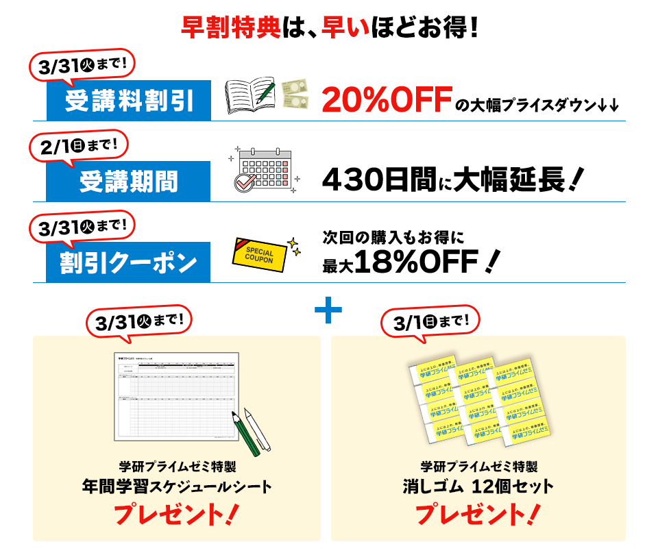 ・受講料がさらに20%OFF! ・受講期間が430日間に大幅延長!(早割第1弾期間でのご購入のみ) ・最大18%OFF割引クーポン(次回購入用) ・学習に役立つ特製グッズプレゼント