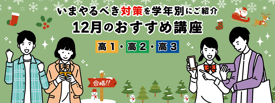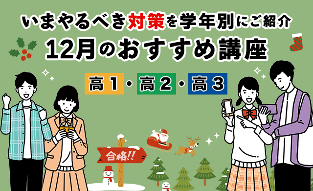 1・2年生の皆さんにとっては、冬は基礎固めの時期。ぜひ映像授業を活用して今までの学びの総まとめをして、有意義な1か月にしましょう!