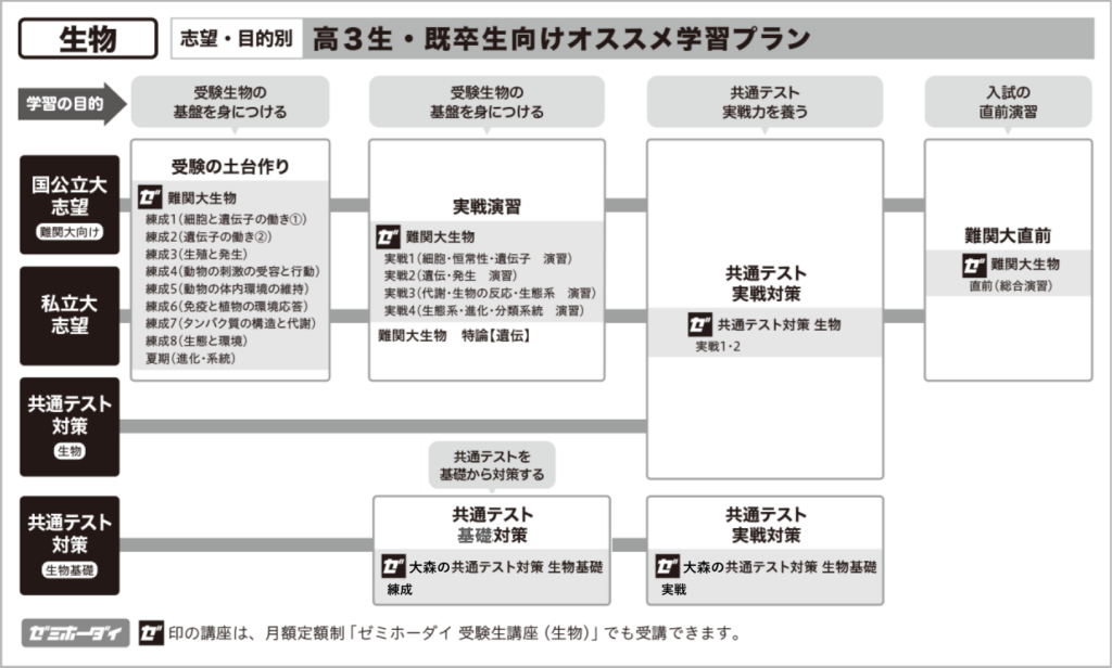 理学部に必要な生物・生物基礎を合わせて学ぶ、山川喜輝先生の「難関大生物」を基幹として、学習スタートする時期と学習目標に応じて必要なユニットを受講していきましょう。 共通テストで生物を受験する人は昆野治虫先生の、生物基礎を受験する人は大森徹先生の共通テスト対策講座も受講しましょう。