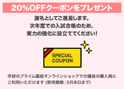 ●アンケート謝礼 学研のプライム講座オンラインショップの20%OFFクーポンを進呈します。受験対策講座の購入に活用して、次年度入試での受験に向けて合格力をアップさせてください!